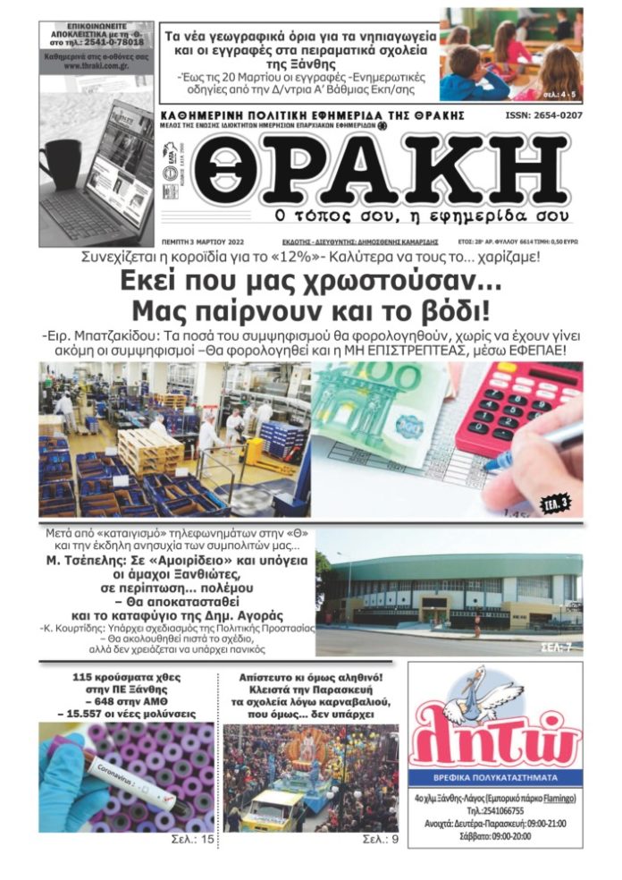 Το πρωτοσέλιδο της Θράκης (28/1)