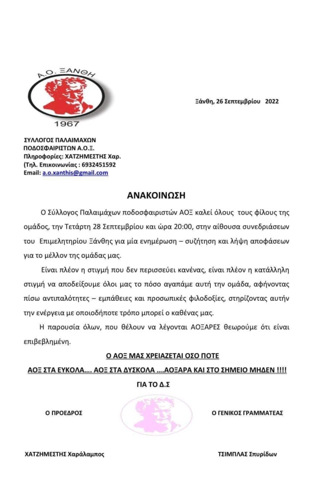 ΚοινωνίαΝέαΠεριφέρεια ΑΜΘΞάνθη Ανοικτό κάλεσμα παλαιμάχων του ΑΟΞ για να συναποφασίσουν για το μέλλον της ομάδας 26 Σεπ 2022 Κοινοποίηση FacebookTwitterLinkedinEmailΕκτύπωση Την Τετάρτη 28 Σεπτεμβρίου, στις 20.00 στην αίθουσα του Επιμελητηρίου Ξάνθης