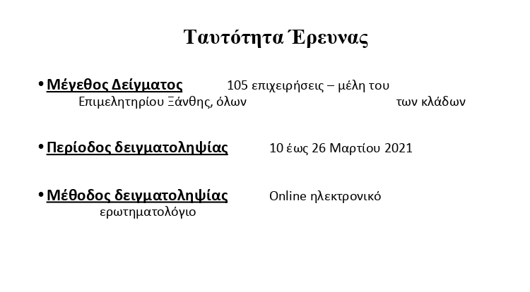 Στο πλαίσιο της διερεύνησης των επιπτώσεων της πανδημίας στην οικονομία της περιοχής μας, το Επιμελητήριο Ξάνθης διεξήγαγε έρευνα με online ηλεκτρονικό ερωτηματολόγιο στο οποίο απάντησαν 105 άτομα – εκπρόσωποι επιχειρήσεων όλων των κλάδων της οικονομίας, το διάστημα μεταξύ 10 έως 26 Μαρτίου 2021.