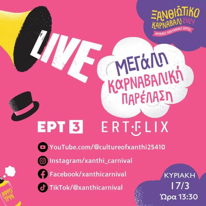 ΕκδηλώσειςΝέαΠεριφέρεια ΑΜΘΞάνθη Δείτε εδώ ζωντανά την μεγάλη καρναβαλική παρέλαση στην Ξάνθη 17 Μαρ 2024 Κοινοποίηση FacebookTwitterLinkedinEmailΕκτύπωση Η Μεγάλη Καρναβαλική Παρέλαση της Ξάνθης, θα μεταδοθεί ΕΔΩ: https://www.youtube.com/watch?v=NWZenXmFBFM