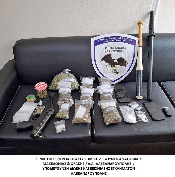 Ακολούθως, σε έρευνα που πραγματοποιήθηκε από αστυνομικούς του Τμήματος Δίωξης Ναρκωτικών της Υποδιεύθυνσης Δίωξης και Εξιχνίασης Εγκλημάτων Αλεξανδρούπολης στις οικίες των δύο συλληφθέντων με τη συνδρομή του αστυνομικού σκύλου ανίχνευσης ναρκωτικών “LAIKA” βρέθηκαν συνολικά και κατασχέθηκαν δύο συσκευασίες και ένα βάζο με ποσότητα ακατέργαστης κάνναβης συνολικού βάρους -13- γραμμαρίων, μικροποσότητα κοκαΐνης, μικροποσότητα ακατέργαστης κάνναβης αναμεμειγμένης με καπνό, -1- πλαστικός τρίφτης, -32- κενές νάιλον συσκευασίες, -1- αεροβόλο πιστόλι, -1- γκλοπ και -1- ξύλινο ρόπαλο. Κατασχέθηκε επίσης το όχημα που χρησιμοποίησαν οι δράστες.