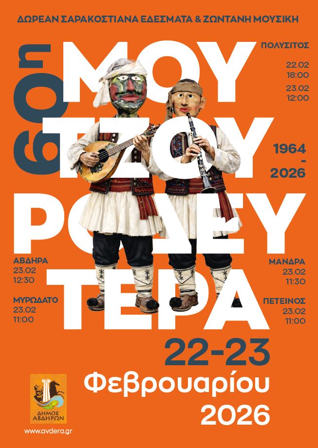 Παράλληλες Πολιτιστικές Εκδηλώσεις θα πραγματοποιηθούν την Καθαρά Δευτέρα 23 Φεβρουαρίου 2026 και στους οικισμούς Αβδήρων (Ιστορική έδρα του Δήμου Αβδήρων), Μάνδρας, Μυρωδάτου και Πετεινού.