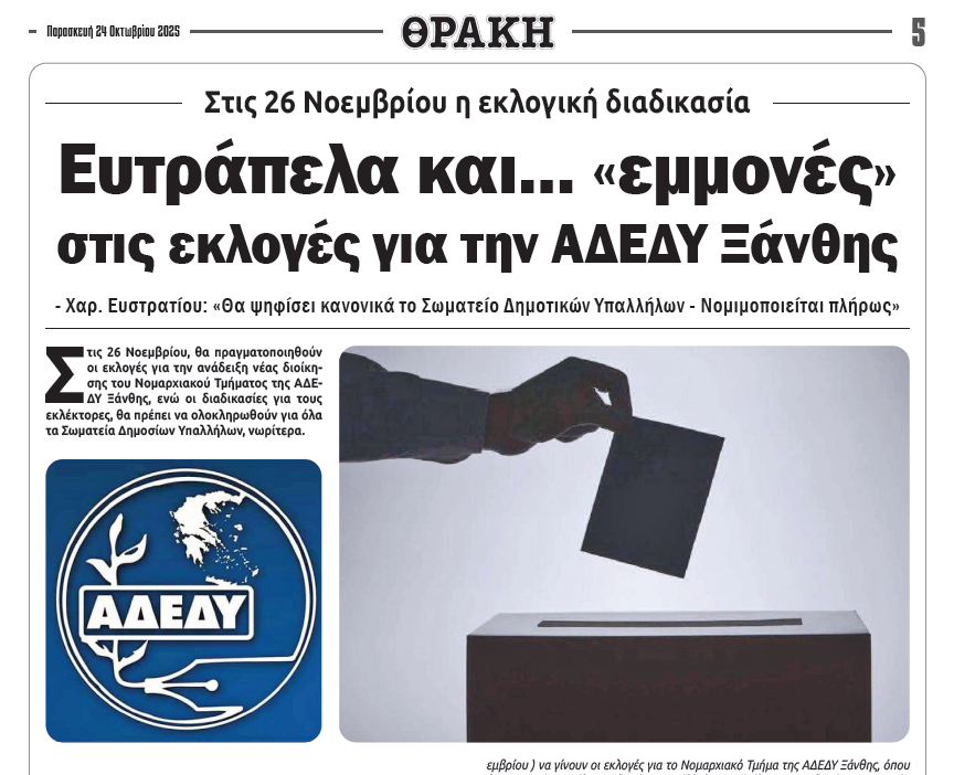 Η «Θ» δημοσίευσε σχετικά ρεπορτάζ στις 23 και 25 Οκτωβρίου, αναφορικά με τις διαφορετικές προσεγγίσεις του προβλήματος που προέκυψε με δύο σωματεία της Ξάνθης και πιο συγκεκριμένα με το Σωματείο Δημοτικών Υπαλλήλων Ν. Ξάνθης, την νομιμοποίηση του οποίου αμφισβήτησε η κεντρική ΑΔΕΔΥ, αλλά και του Σωματείου Εργαζομένων του Νοσοκομείου Ξάνθης στις εκλογές του οποίου περικόπηκε ένας σύνεδρος λόγω διαφορετικής προσέγγισης από την δικαστική λειτουργό.