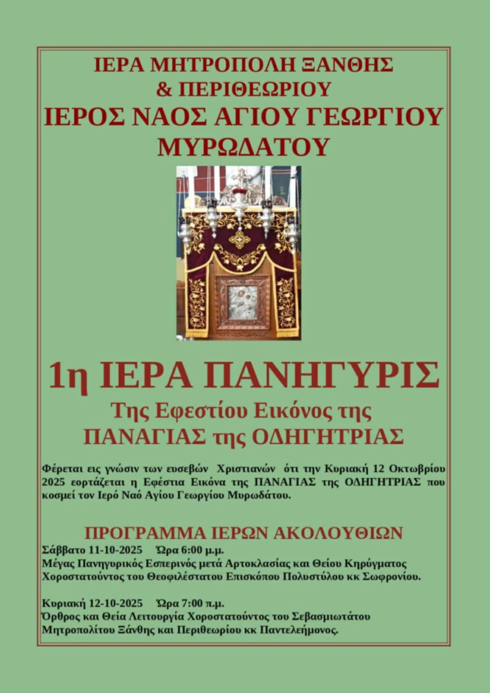 ΝέαΠεριφέρεια ΑΜΘΞάνθη Πανηγυρίζει η Παναγία η Οδηγήτρια, στον Ι.Ν. Αγίου Γεωργίου στο Μυρωδάτο (το πρόγραμμα των Ακολουθιών) 11 Οκτ 2025 Κοινοποίηση FacebookTwitterLinkedinEmailΕκτύπωση