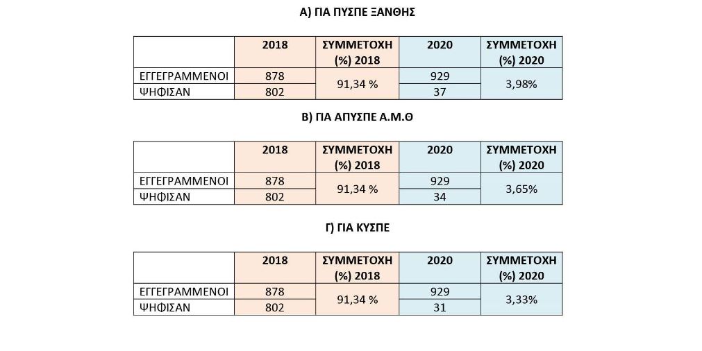 Μόλις 37 δάσκαλοι, από τους 929 εγγεγραμμένους (ποσοστό 3,98%) ψήφισαν ηλεκτρονικά στις 7 Νοεμβρίου για το ΠΥΣΠΕ Ξάνθης, ενώ μολις 34 άτομα (ποσοστό 3,65%) για ΑΠΥΣΠΕ ΑΜΘ και 31 άτομα (3,33%) για το ΚΥΣΠΕ, σπάζοντας την ‘γραμμή’ της Διδασκαλικής Ομοσπονδίας.