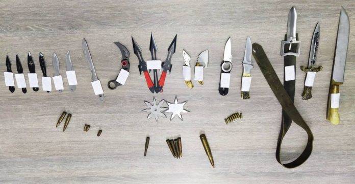 Κατείχε και κατασχέθηκαν 16 μαχαίρια διαφόρων τύπων, 1 ξιφίδιο, 1 ζώνη με αγκράφα μαχαίρι, 2 αστέρια ρίψης, 19 φυσίγγια και 1 ναρκωτικό δισκίο