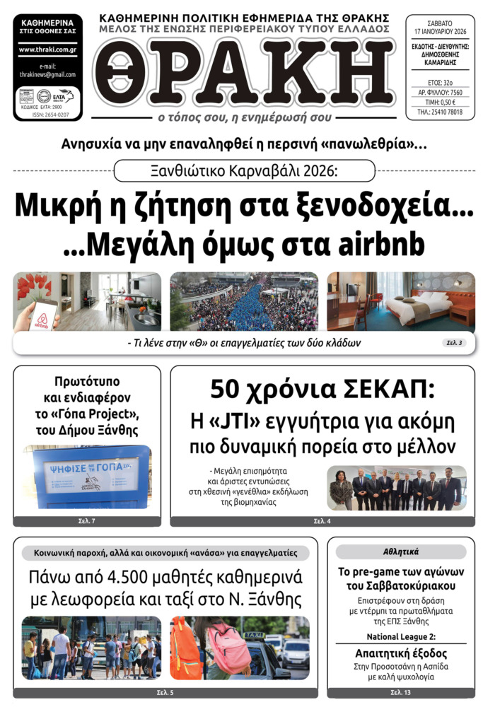 Το πρωτοσέλιδο της Θράκης (17/1)