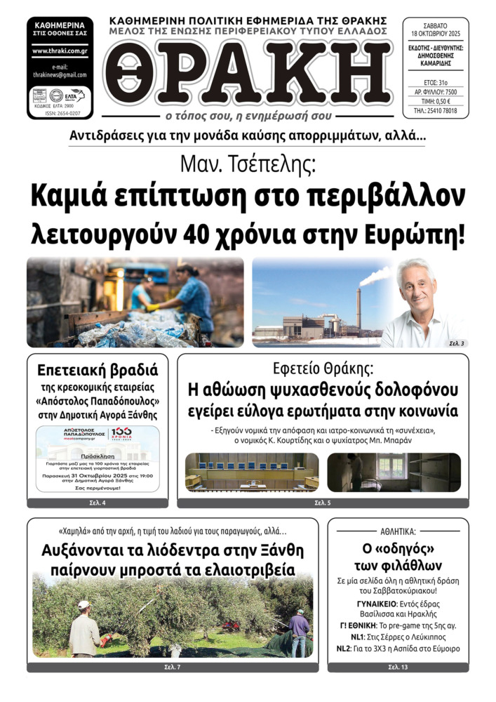 Το πρωτοσέλιδο της Θράκης (18/10)