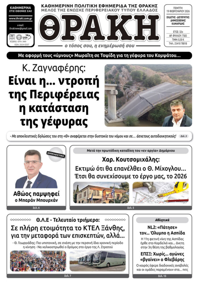 Το πρωτοσέλιδο της Θράκης (19/2)