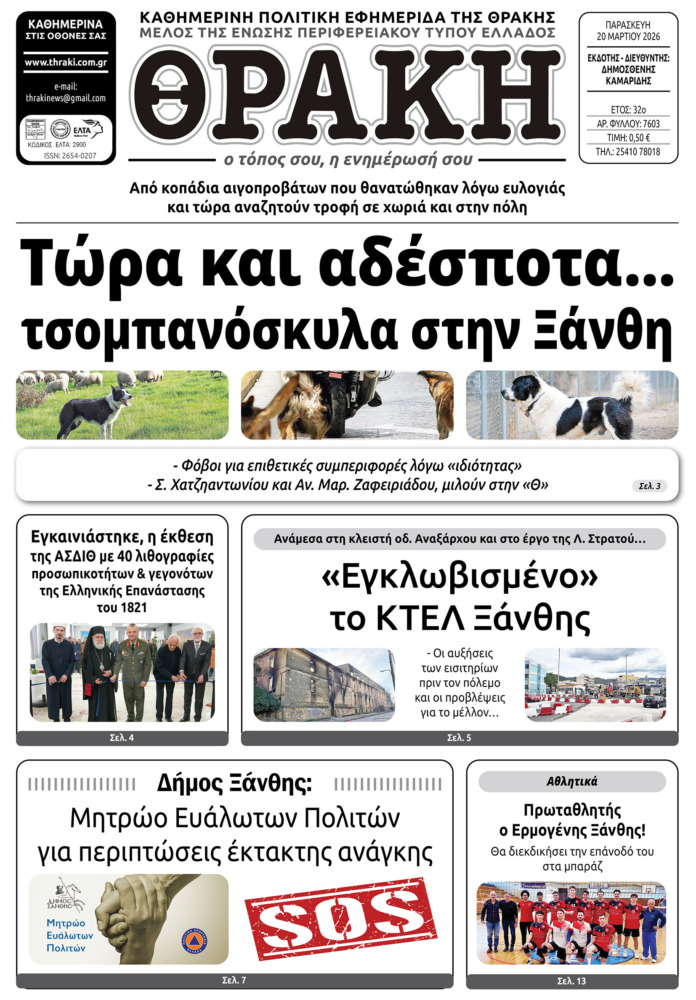 Το πρωτοσέλιδο της Θράκης (20/3)