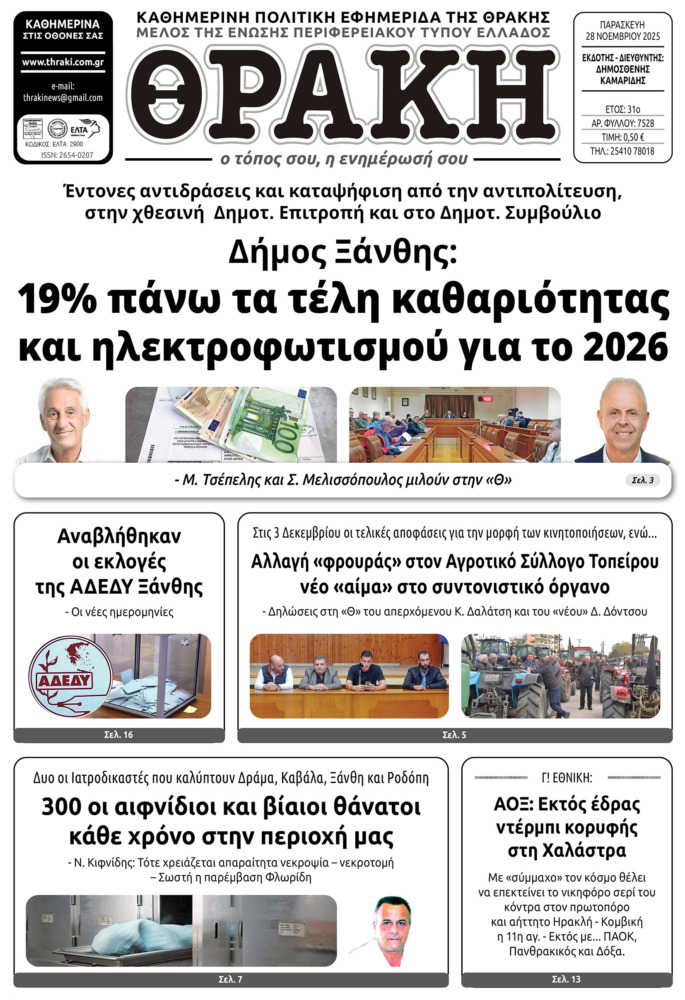 Το πρωτοσέλιδο της Θράκης (28/11)