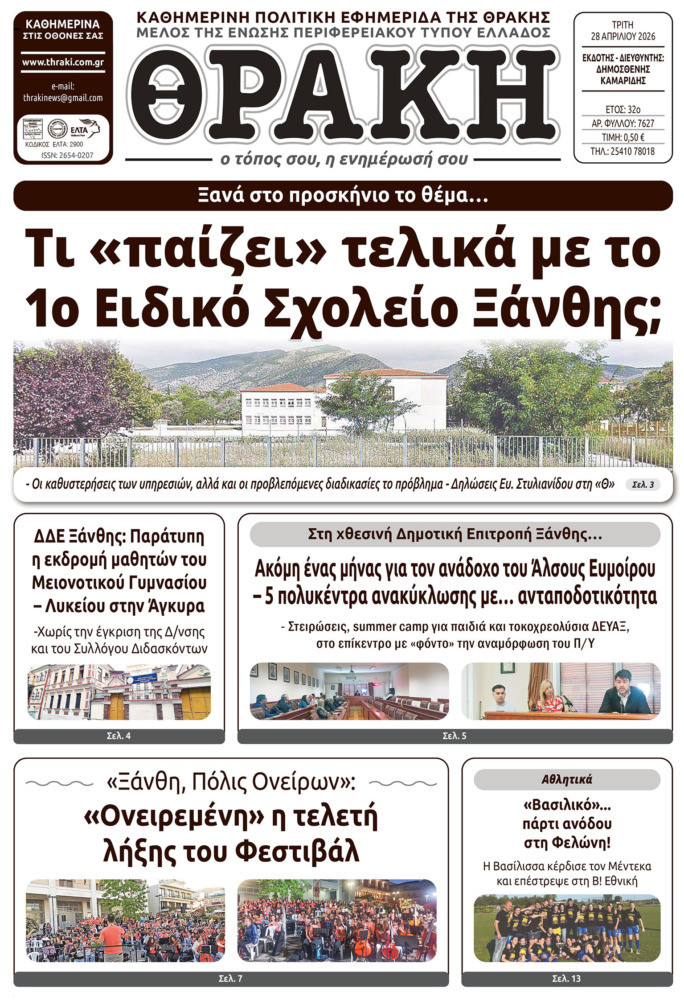 Το πρωτοσέλιδο της Θράκης (28/4)