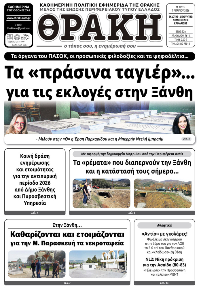 Το πρωτοσέλιδο της Θράκης (7/4)