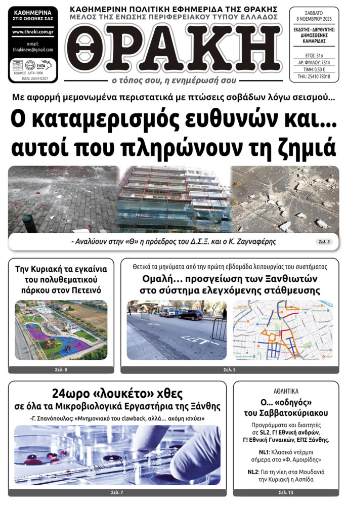 Το πρωτοσέλιδο της Θράκης (8/11)