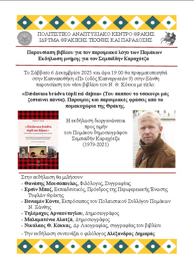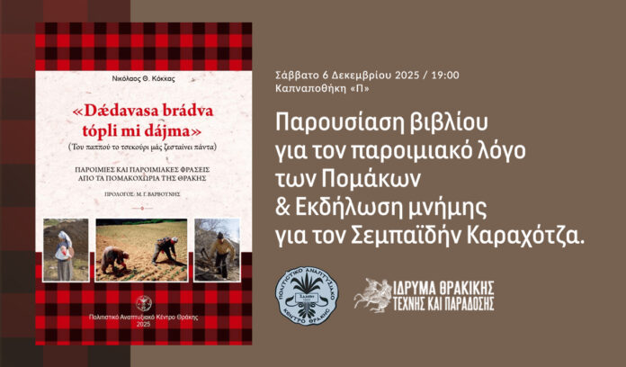 Το Πολιτιστικό Αναπτυξιακό Κέντρο Θράκης και το Ίδρυμα Θρακικής Τέχνης και Παράδοσης διοργανώνουν την παρουσίαση του νέου βιβλίου του Ν. Θ. Κόκκα με τίτλο: «Dǽdavasa brádva tópli mi dájma» (Του παππού το τσεκούρι μάς ζεσταίνει πάντα). Παροιμίες και παροιμιακές φράσεις από τα πομακοχώρια της Θράκης.Η εκδήλωση θα γίνει στην Ξάνθη το Σάββατο 6 Δεκεμβρίου 2025 και ώρα 19:00 στην Καπναποθήκη «Π», οδός Καπνεργατών 9, Ξάνθη και διοργανώνεται στη μνήμη του Πομάκου δημοσιογράφου και συγγραφέα Σεμπαϊδήν Καραχότζα, ο οποίος έφυγε από τη ζωή πριν από τέσσερα χρόνια, στις 7 Δεκεμβρίου 2021.